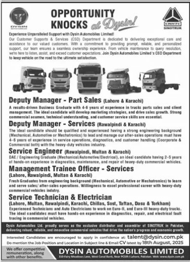 Both Male and Female candidates can apply for this Dysin Jobs 2025 who have the Qualification: Graduate Degree, DAE Degree, 2-5 years of experience, and many more experienced candidates should apply before 18 August 2025.